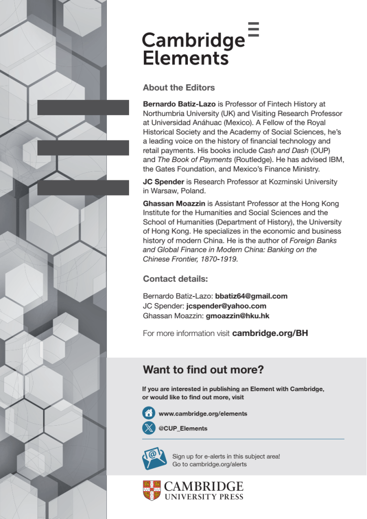 Together with Prof. Bernardo Batiz-Lazo and Prof. JC Spender, I am editing a new book series for Cambridge University Press’s Cambridge Elements, the Elements in Business History.